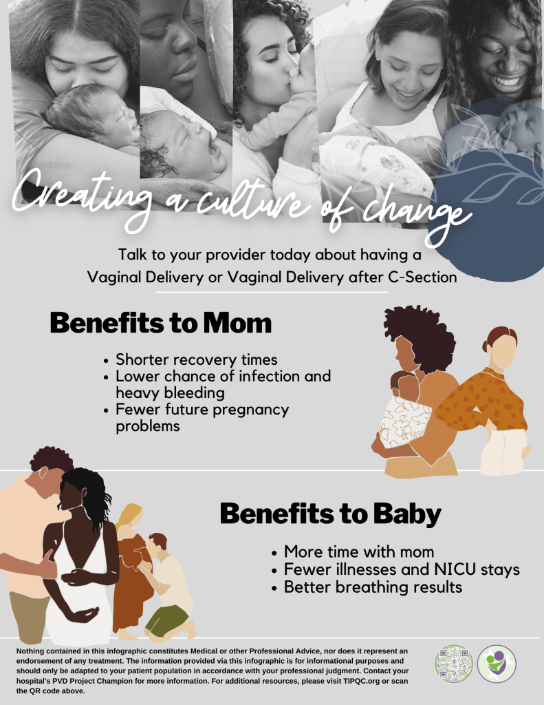 In early 2023, 35 hospitals throughout the state joined TIPQC with the goal of decreasing the c-section rate to 23.6% for women presenting with nulliparous, term, singleton and vertex (NTSV) pregnancies to align with the Healthy People Goal of 2030. C-sections are one of the most popular surgeries in the United States despite being associated with increased risk of hemorrhage, infection, uterine rupture, and longer recovery time. After more than 18 months of hard work, the Promotion of Vaginal Delivery project moved into sustainment in September 2024.